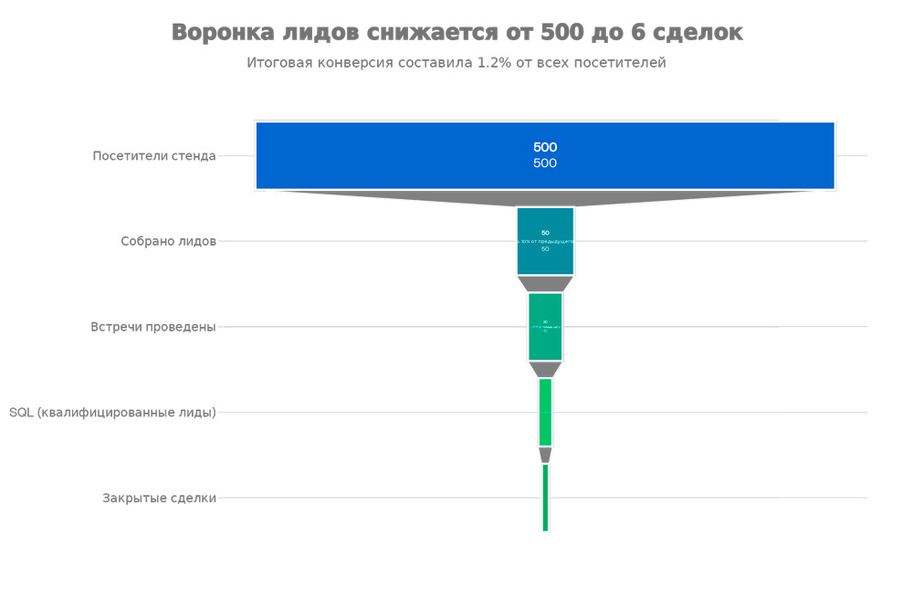 Высокий CPL, но хорошая конверсия в сделки? Значит, выставка привлекает качественные лиды. Фокусируйтесь на коэффициенте конверсии, а не на количестве.