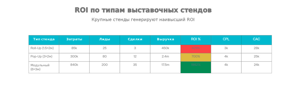Вычислили ROI > 100%? Увеличьте бюджет на следующую выставку на 20–30%. Эффективный канал нужно масштабировать.