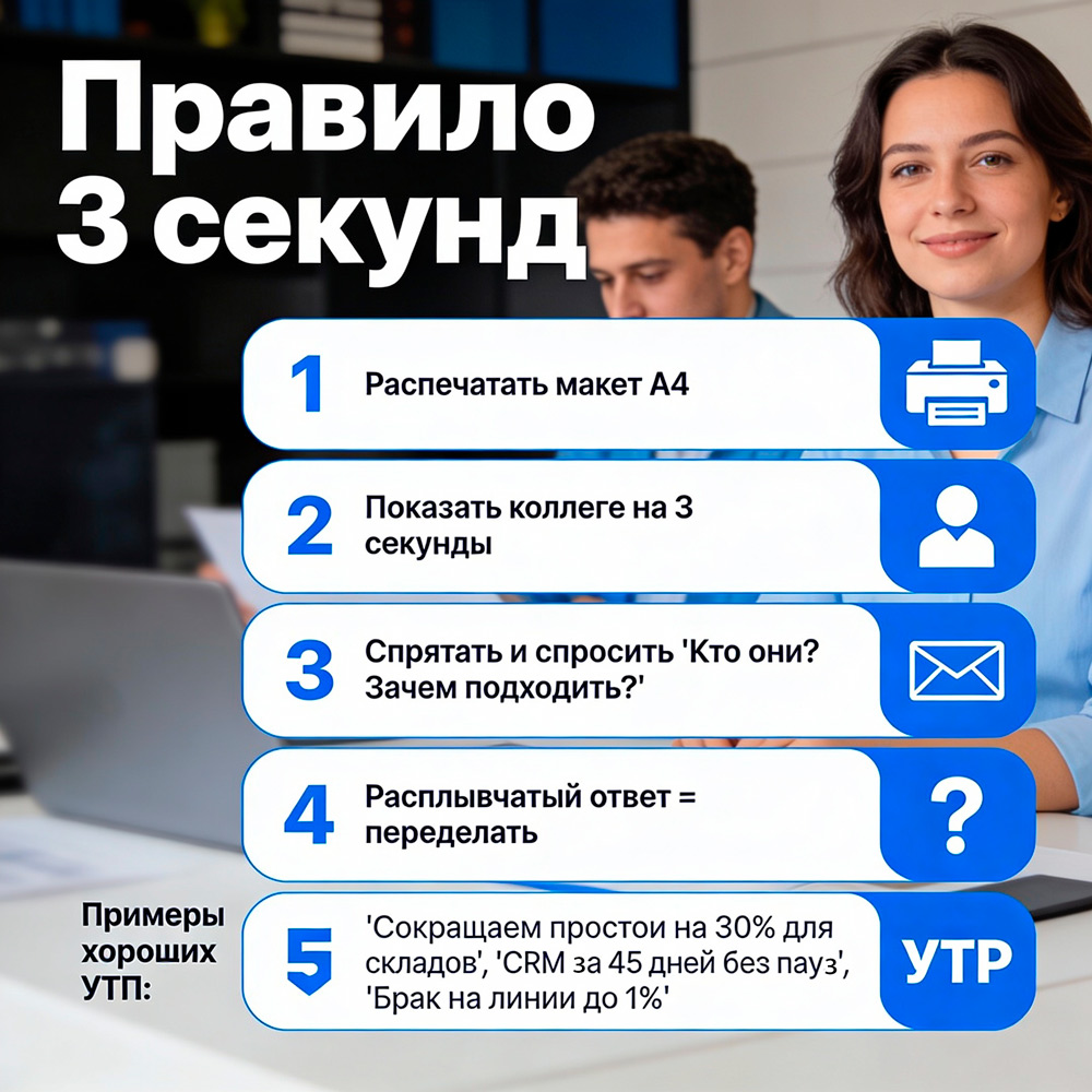 Формула: [Цифра/срок] + [польза] + [для кого]. Примеры B2B: