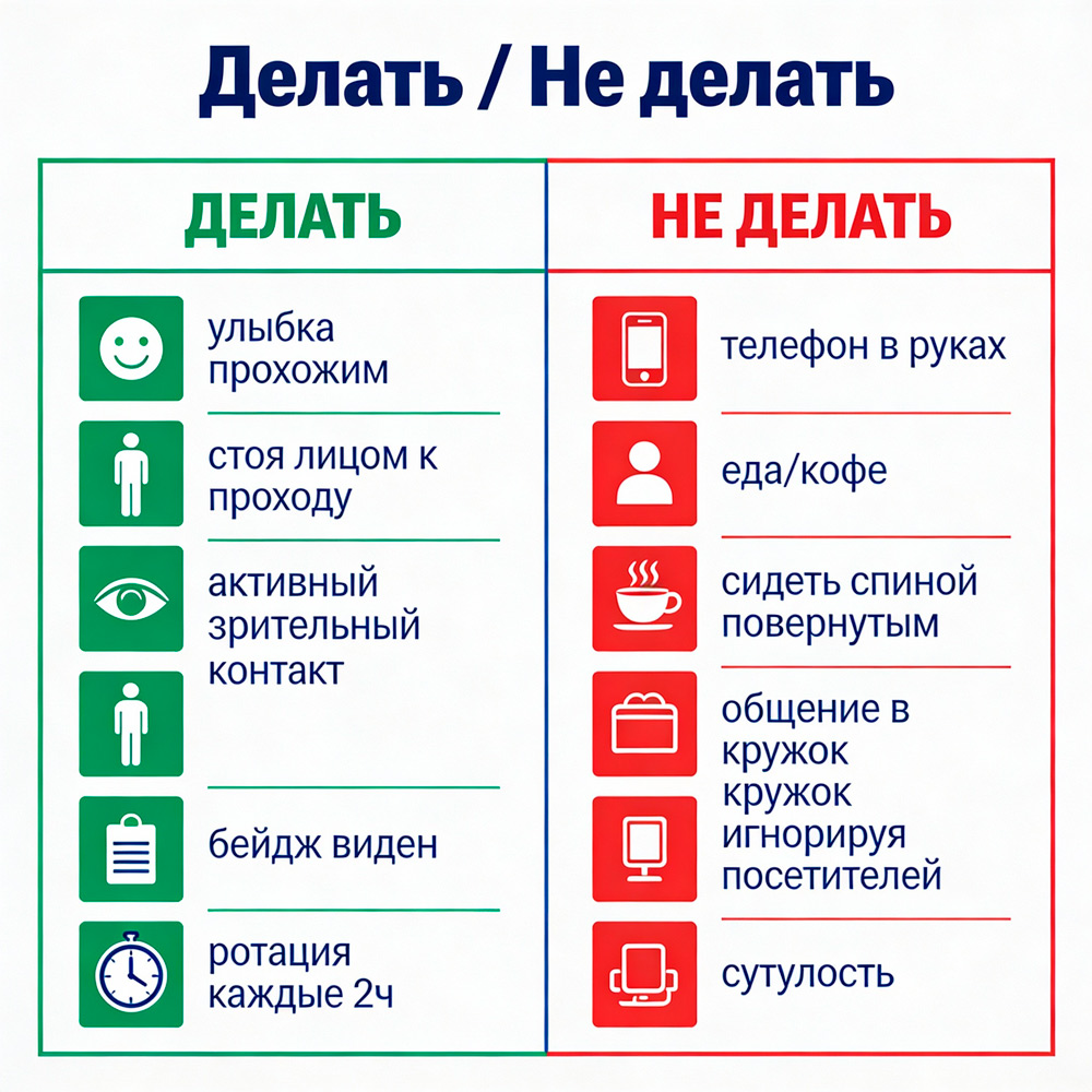 - Запрещено: телефон/еда в зоне, сидеть спиной/в кружок, игнор потока.