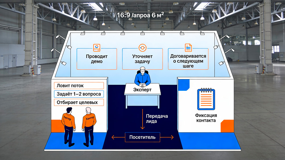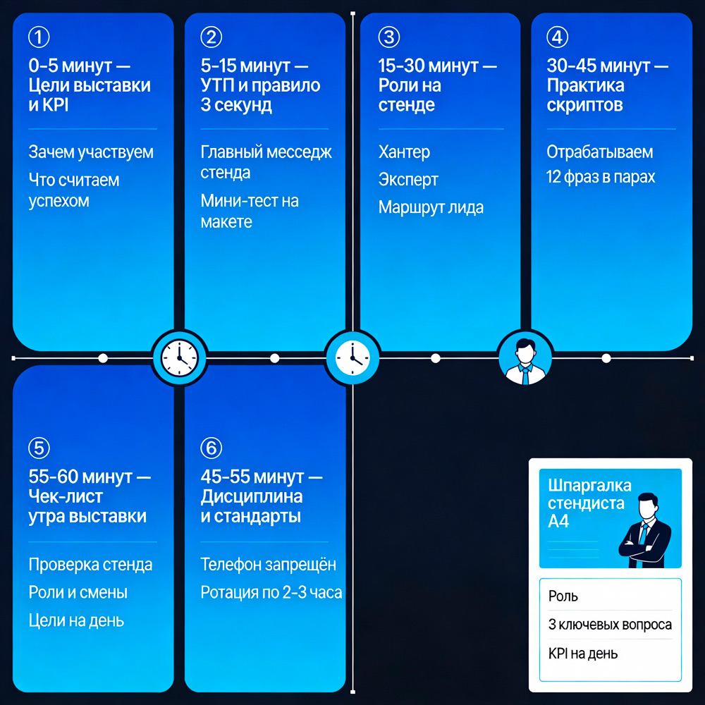- 0-5 мин: Цели выставки, успех = лиды/следующий шаг.