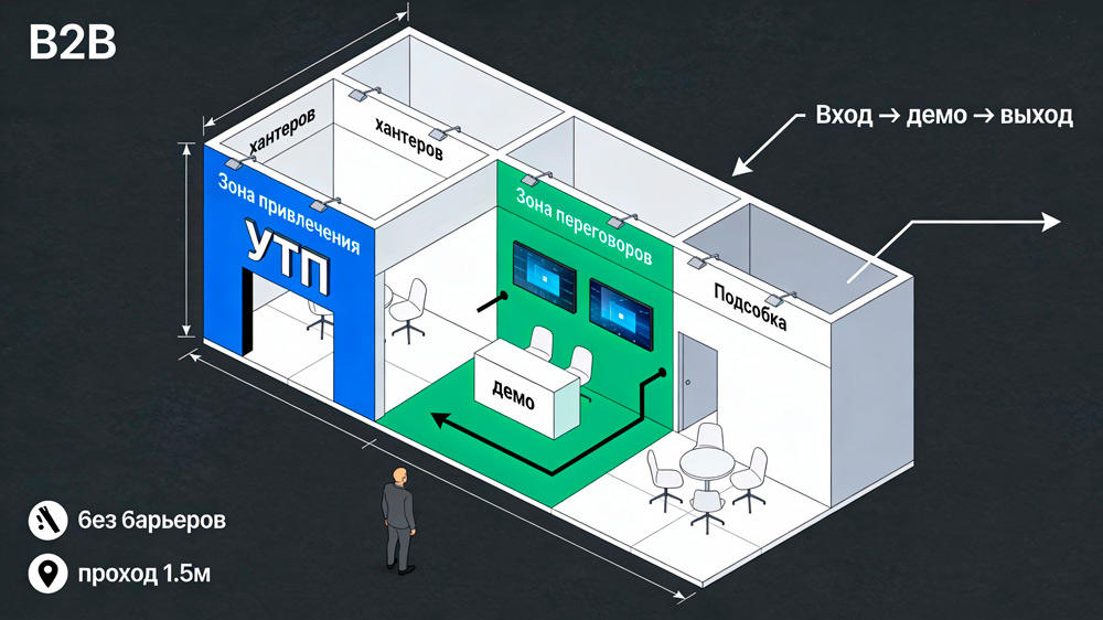 Взгляд: УТП → свет → демо. Движение: коридор внутрь (для малых стендов).