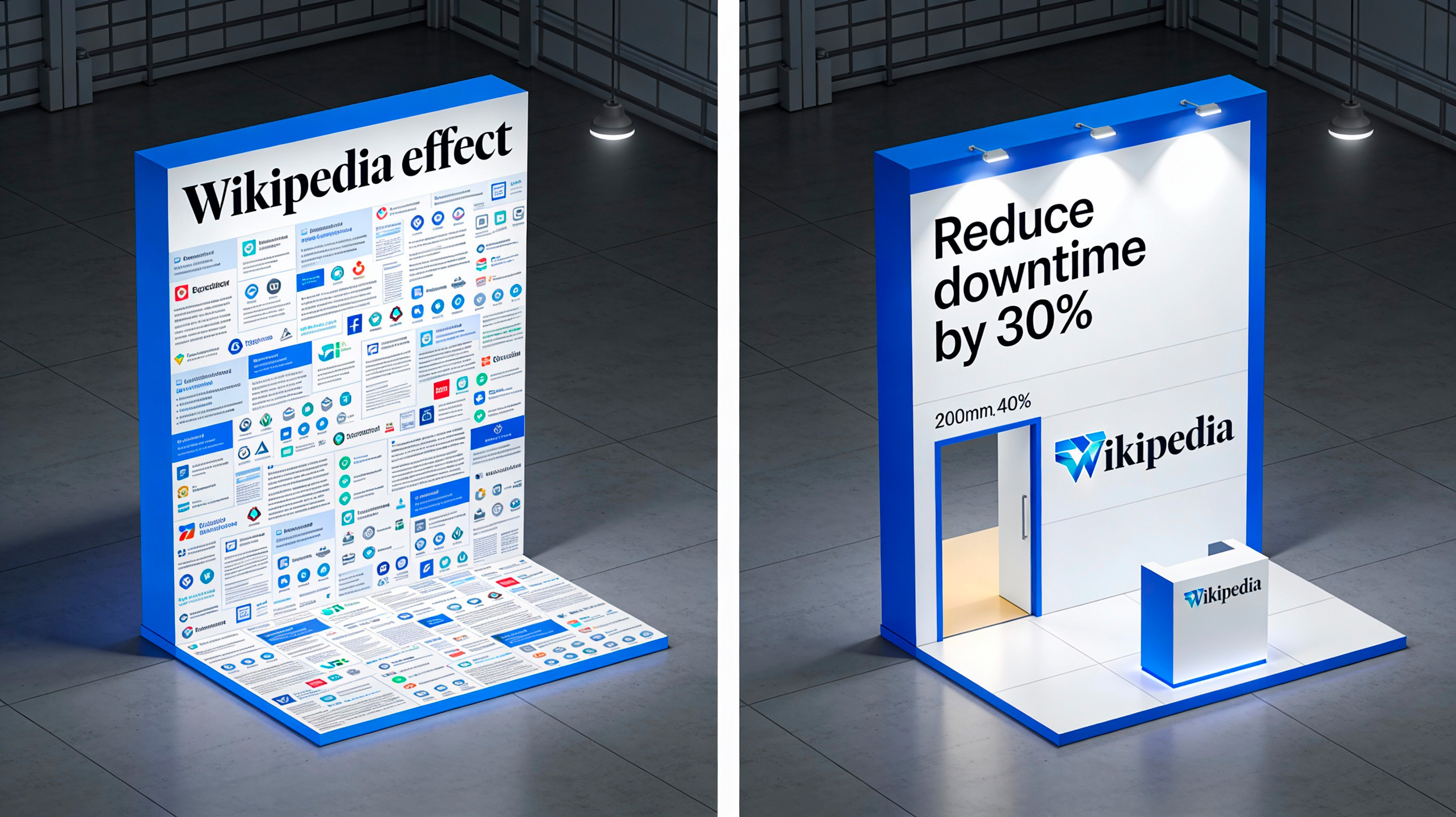 Стенд — билборд на трассе: 3 секунды на решение «подойти или нет». Перегруженный «эффект Википедии» (текст, иконки, схемы) отпугивает.