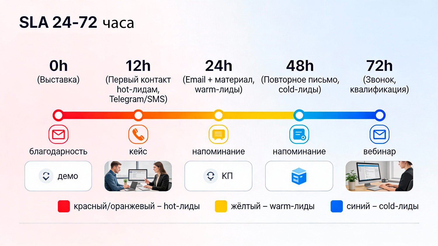 - Action: first touch письмо в Telegram/LinkedIn за 2ч после выставки; call подтверждение; отправить релевантный кейс.
