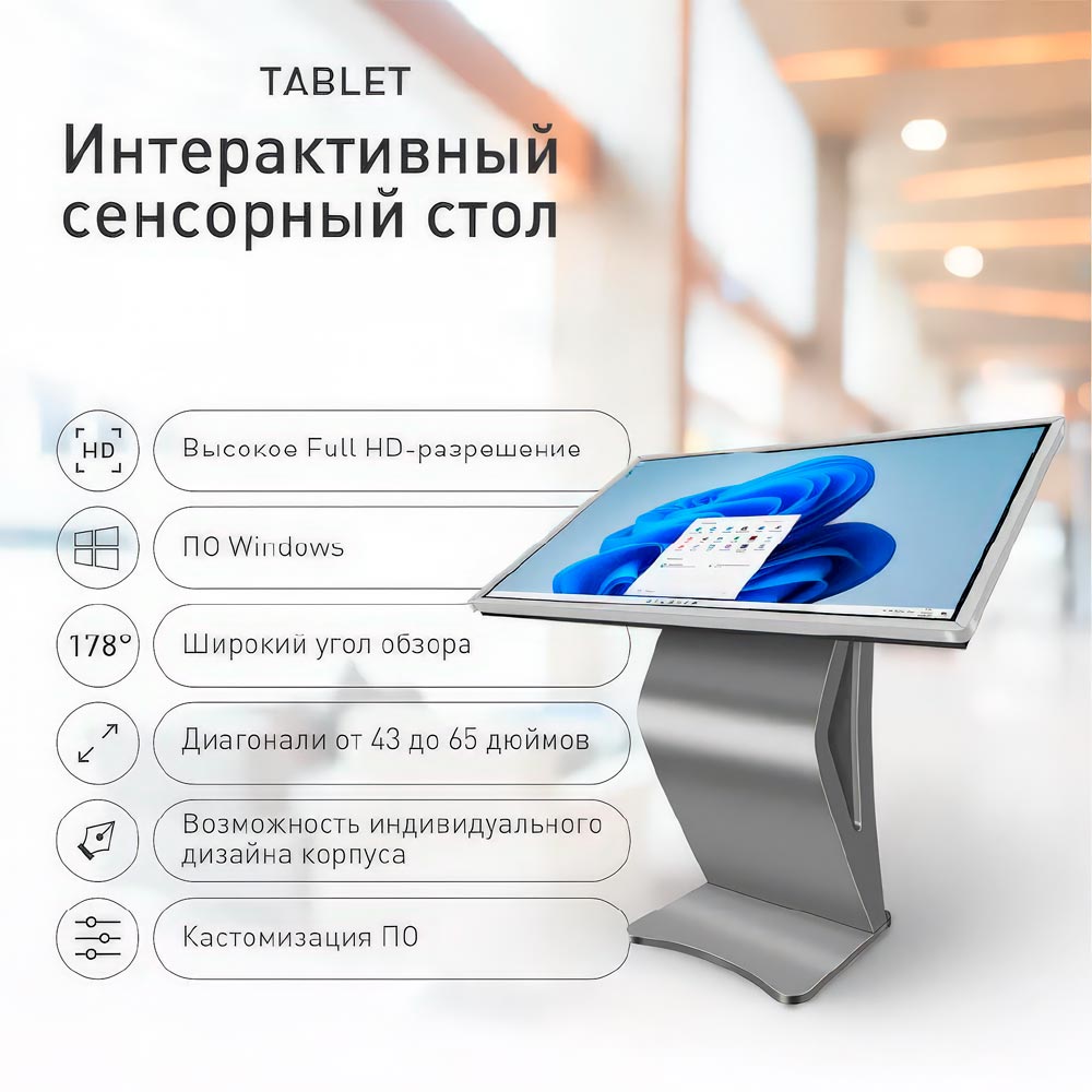 Оживите любое пространство с помощью нашего интерактивного сенсорного стола — идеального симбиоза стильного дизайна, передовых технологий и исключительной прочности. Это готовое решение для вовлечения клиентов, студентов и гостей, превращающее стандартное взаимодействие в незабываемый цифровой опыт.